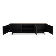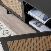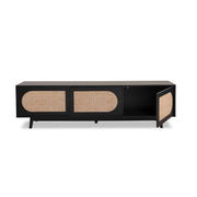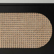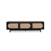 The three cupboards provide plenty of useful, spacious storage. The centre cupboard also includes internal shelving. Use the cupboards to hide away devices, consoles, and essentials. As a bonus, the back panel includes a hole for cords so you can keep them tidy. We love the painted finish in a rich, statement black. This dark colourway makes the upholstered rattan door panels pop for a textured, layered look in any space.