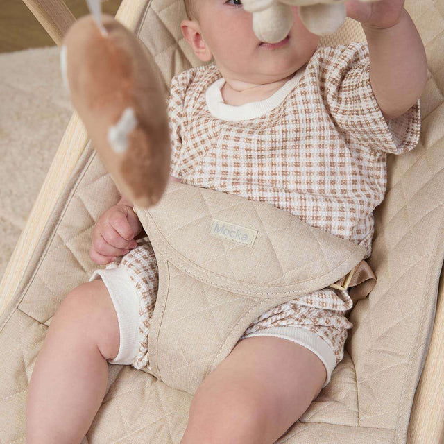 The Raven Rocker in Natural is perfect for a nursery or living room. It folds down easily, has a removable, washable cover, and comes with a detachable toy mobile. Keep your baby entertained and comfortable.