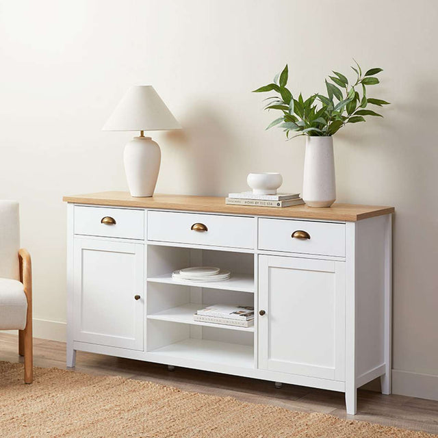 The Hastings Buffet blends a light timber look with white drawers for a timeless farmhouse feel. It makes any room cosy and welcoming.