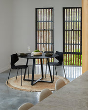 Whilst your dining set doesn’t need to be an exact match to the surrounding furniture and decor, it should tie back in some way. Look for colours, textures and finishes that complement your existing interior. In an open-plan dining and living room space, you might choose fabric-upholstered chairs to connect your dining area to the sofas, armchairs and ottomans.