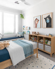 After all the effort you have put into organising the kids’ bedroom furniture, it’s time to focus on the fun part, the finishing touches! Style the bunk beds with a colourful throw rug, pop a nightlight on the bedside table and position some fun pom-pom baskets by the play area for storage and clean-up.