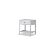 Introducing the Cove Bedside Table in striking white, a perfect addition to refresh your space. This classic coastal-inspired piece, with a white painted finish, offers optimal height and space. Whether you place it next to your bed or sofa, the shaker profile drawer and additional storage shelf provide functionality wrapped in style. Its brushed bronze metal drawer knob is the perfect finishing touch, balancing elegance and practicality effortlessly.