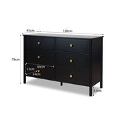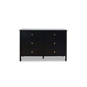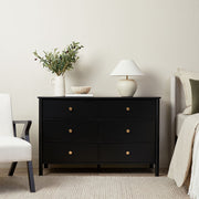 Introducing the Delaney Six Drawer - Black. This classic dresser, crafted from MDF with pine wood legs, features sleek black drawers with elegant gold handles. Its modern farmhouse style is perfect for any bedroom, creating a sophisticated look. The stylish tubular legs add a touch of chic contrast to this timeless piece.