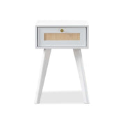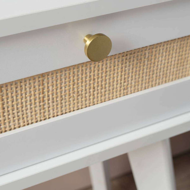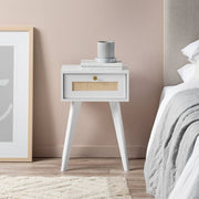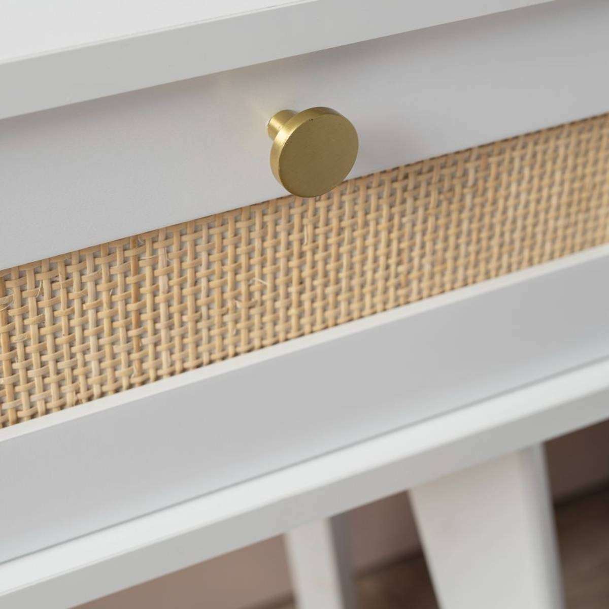 Featuring bright white cabinetry that really showcases the natural, organic beauty of the weaved rattan panel in the centre of the drawer front, this side table would easily suit chic bohemian, coastal or Scandinavian living. Paired with a brushed gold handles, round handle, this bedside table will feel like a luxury in your master bedroom, guest bedroom or living spaces., Create symmetry in a room and frame your bed using a pair of these bedside tables or add a single side table beside a lounge or armchair.