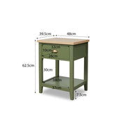 Introducing the Hastings Bedside Table in Olive Green/Natural. Crafted from durable MDF, it features a spacious drawer and an open shelf for handy bedside storage. With its timeless farmhouse style and trendy dark olive-green finish, this piece suits any bedroom, effortlessly adding a touch of charm and practicality.
