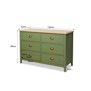 Introducing the Hastings Six Drawer in Olive Green/Natural, perfect for any bedroom or living space. Crafted from durable MDF with a stylish mix of green and light wood-look, it reflects modern farmhouse charm. Featuring six easy-slide metal handles, this timeless dresser combines functionality with a chic, sophisticated elegance.