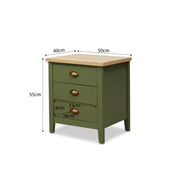The Hastings Three Drawer Bedside Table in Olive Green/Natural brings modern farmhouse charm to your bedroom. Made from solid MDF with sturdy metal handles, it features a rich olive green tone paired with a wood-look top. Perfect for adding stylish storage to any bedroom.