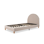 Featuring an upholstered, arch bedhead and frame, this shape gives this single or king single bed an elegant, designer look, while also providing a handy backing for kids as they lounge, read or play. This modern design also means this upholstered single, or king single bed would work well in a guest bedroom or holiday accommodation. Well-constructed with a strong frame, wooden slats and supportive legs, this bed is super sturdy for kids and guests to sleep with ease.