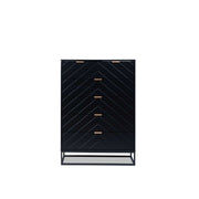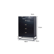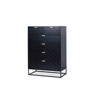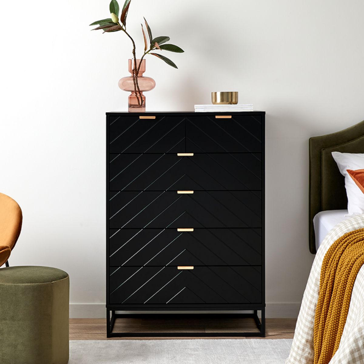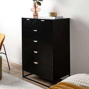 Add luxe style to your bedroom with the Inca Tallboy Black. Sure to be a statement piece, this tall dresser unit features a subtle, engraved pattern on the drawer fronts perfect for adding interest and texture to a space. Accented with gold handle details, it has a bold, luxe glamour that will easily translate to your home.