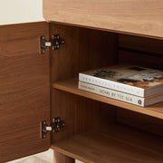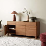 The Leeroy Buffet's chunky solid wood legs and mid-century curves give it a unique and trendy look. It enhances any room with its sophisticated and stylish appearance.