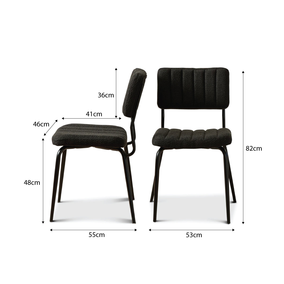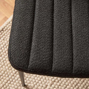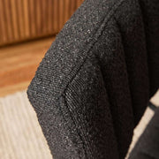 The black boucle fabric and ribbed detailing create a timeless, mid-century-inspired look. Perfect for adding a modern touch to your dining space while suiting classic and contemporary interiors alike.