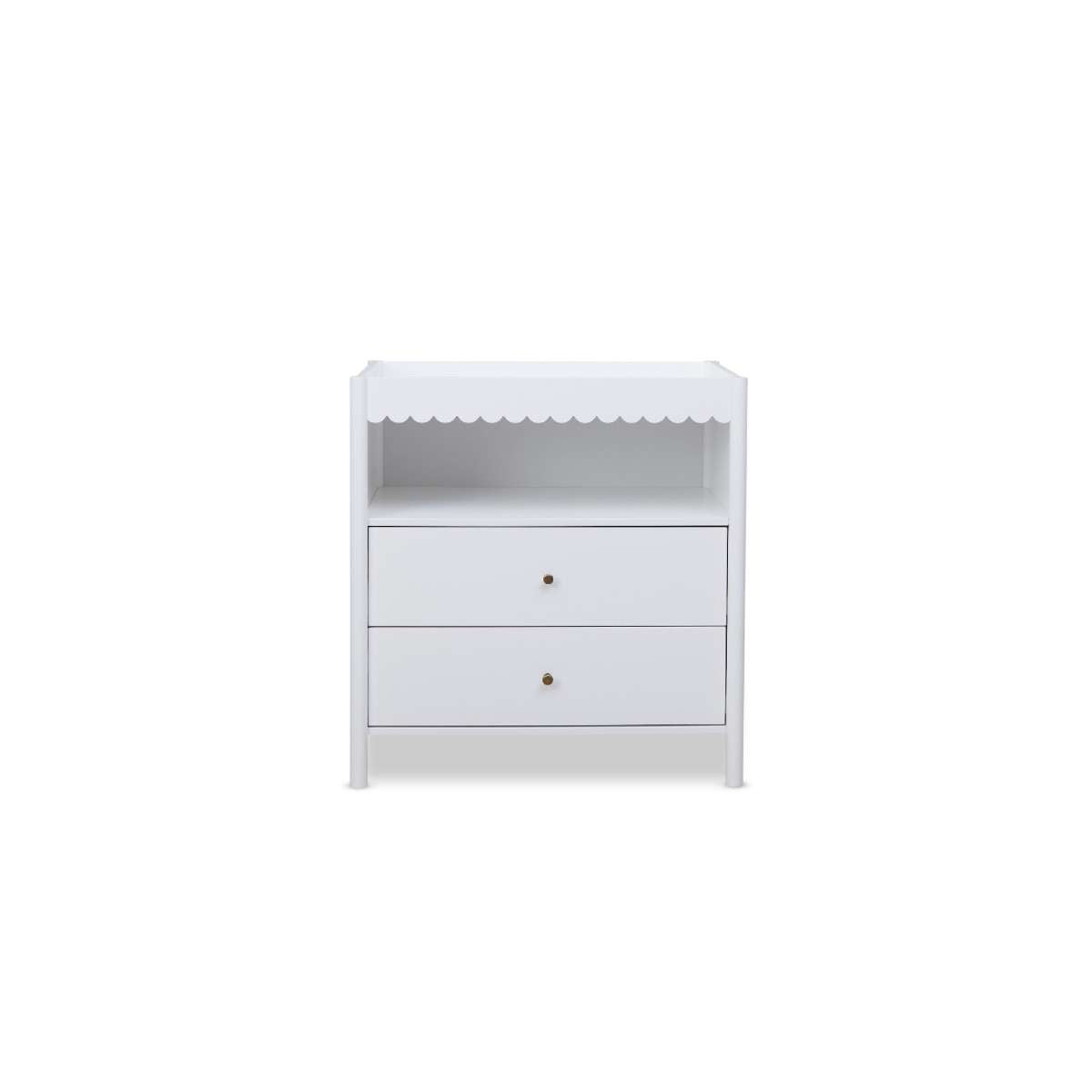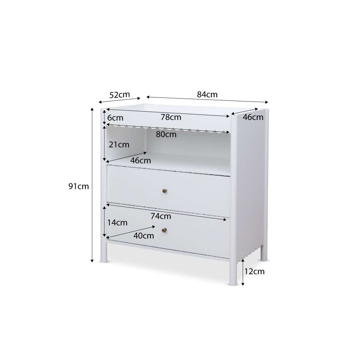 Transform your nursery into a stylish and functional space with the Maisie Scalloped Change Table. Featuring two roomy lower drawers and a practical, elevated design, this changing table is perfect for any Modern Coastal - inspired nursery. The raised edge tray ensures a safe changing environment, while its ideal height makes caring for your little one effortless.