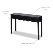 Add a touch of contemporary flair to your entranceway or living space with the Malena Console Table in Black. Embracing contemporary design with its wavy and textured aesthetics. The textured finish beautifully complements the distinctive wavy pattern, while the two spacious drawers offer storage for keys, mail and everyday essentials providing plenty of surface area to display your favourite decor items or a vase of fresh flowers. Easily combine this piece with your own personal style to create a space that reflects your aesthetic.