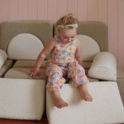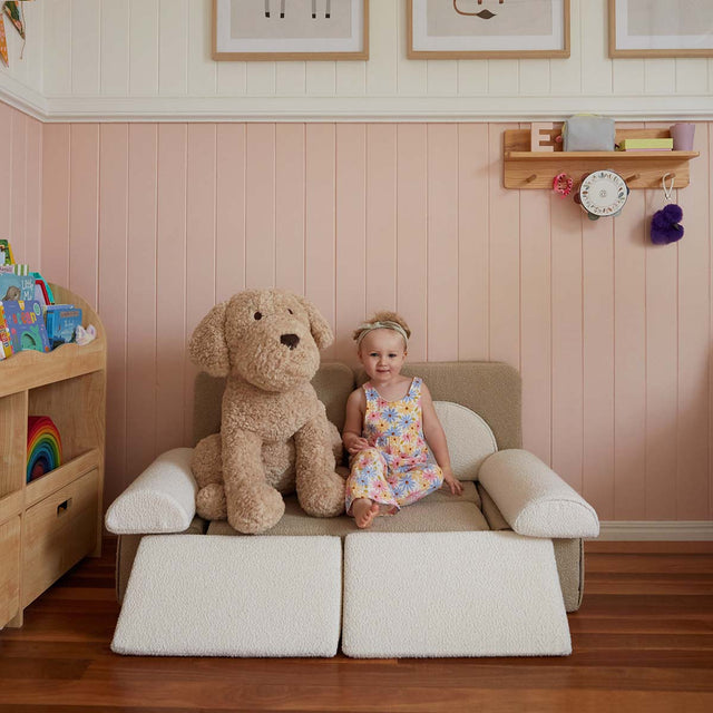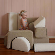 Transform playtime and living spaces with the Modular Play Sofa in cream and beige boucle. Its neutral tones blend effortlessly into playrooms and lounge rooms alike. With modular prism shapes – rectangles, triangles, and semi-circles – kids can go wild with endless seating designs while you enjoy a stylish, functional addition to your home.