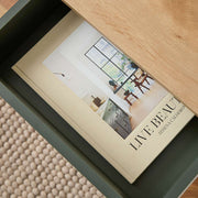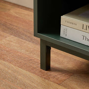 Its mid-century inspired look, sleek lines, and matt green finish paired with a natural wood accent create a versatile design that complements modern, retro, or minimalist bedrooms.