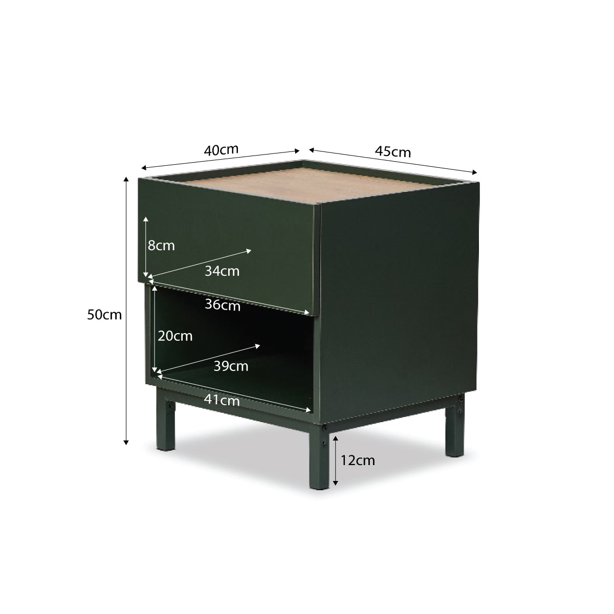 Add style and storage to your bedroom with the Murphy Bedside Table in Green/Natural. Featuring a smooth dark green finish with a natural wood-look accent, this mid-century inspired piece suits modern or retro spaces. With a pull-out drawer, open shelf, and durable powder-coated legs, it’s perfect for keeping essentials close and your room looking tidy.