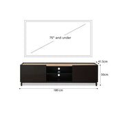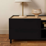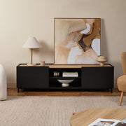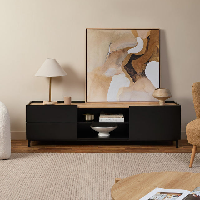 Transform your living room with the Murphy Entertainment Unit in Black/Natural. Featuring one cupboard, two spacious drawers, and sleek powder coated metal legs, this unit combines storage and style. The matte black finish contrasts beautifully with the natural wood-look, making it perfect for mid-century or modern spaces. Its clean lines offer timeless appeal for any home.
