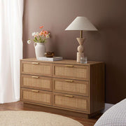 Featuring a warm wood-look finish, rattan drawer fronts, and brushed gold handles, this dresser blends modern coastal style with practicality, enhancing any bedroom or living area with a natural charm.