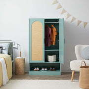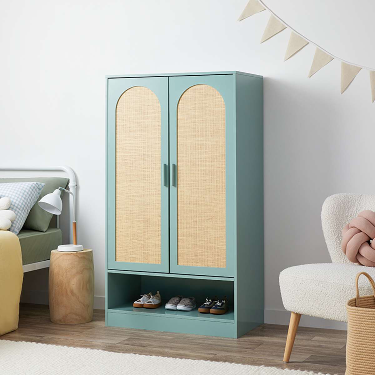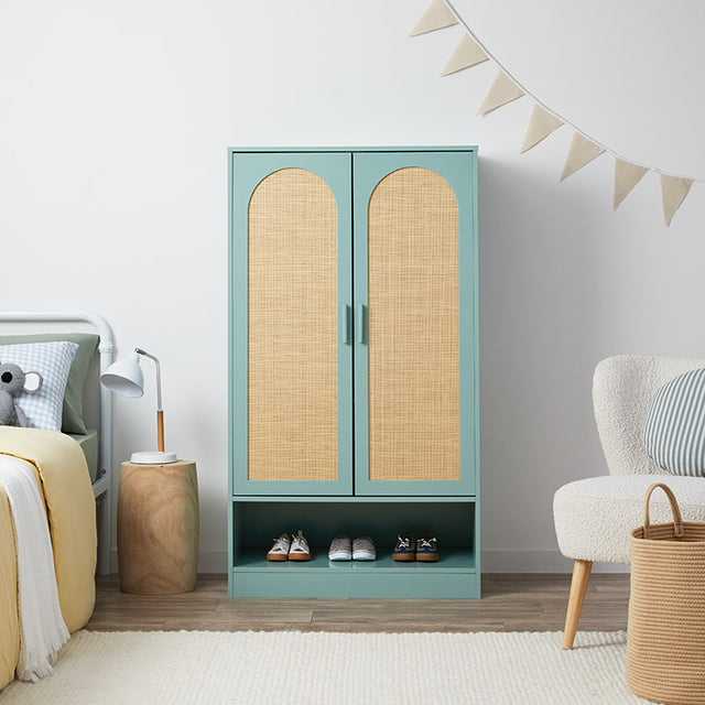 The Pippin Wardrobe in a vibrant green is perfect for adding a playful pop of colour to any room. With its neutral rattan door fronts, this wardrobe easily blends with both neutral tones and bold hues. Featuring a two-door cupboard, hanging space, and additional shelving, it’s as practical as it is stylish. Ideal for any contemporary space, it also coordinates with the Pippin bedside table for a complete look.