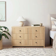 Bring timeless farmhouse charm to your home with the Portland Six Drawer in Natural. Featuring six sliding drawers with black metal knobs, a warm wood-look finish, and groove detailing, this versatile piece is perfect for bedrooms or living spaces. Its classic design offers a practical storage solution while complementing a variety of interior styles.