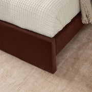 Introducing the Quinn Queen Bed in rich chocolate velvet. This classic-shaped bed frame features a cushioned bedhead for extra comfort and pine timber slats for strong support. Inspired by mid-century design, its stylish colour suits any bedroom. Perfect for adding a touch of elegance and warmth to your space.