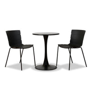 Transform your outdoor space with the Ravello Outdoor Bistro Three Piece Dining Set in Black. This sleek set includes two stackable dining chairs with ribbed plastic seats and durable powder-coated metal legs, paired with a compact round table designed for smaller areas. Combining modern style and practicality, the black finish ensures a cohesive, timeless look that enhances any patio or balcony setting.