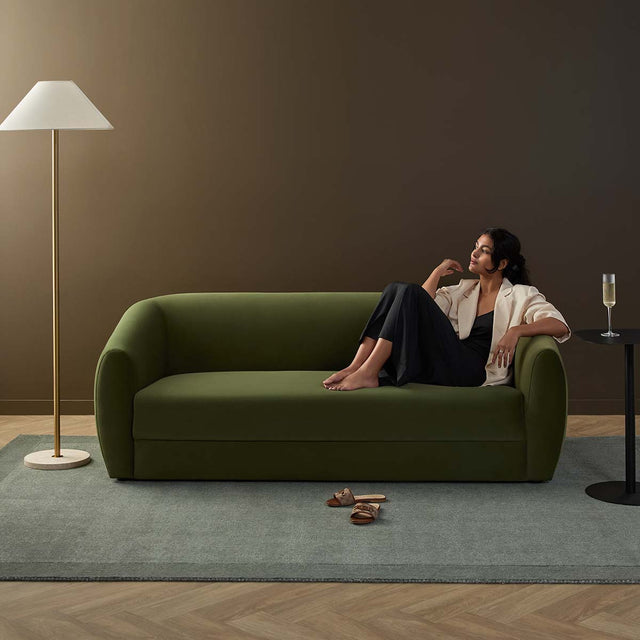 Made from rich olive green velvet, this sofa's curved design adds elegance to any room. Its stunning look makes it a focal point, enhancing your home’s style.