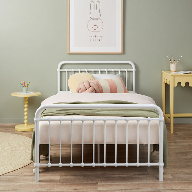Mocka's Sonata Bed - King Single - White is a vintage inspired bed that will add a contemporary style to your child's bedroom. The classic design combined with the neutral colour allows you to style different decor into the room to create a modern, vintage or whimsical themed room. Make a classic statement with traditional white. Your child will enjoy sleeping in a comfortable and supportive bed, with its powder coated steel frame and durable plywood slat base. You will love how Mocka's Sonata Bed - King Single - White adds style and charm to your kid's bedroom or guest room.