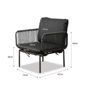 Upgrade your outdoor space with Mocka's Sorrento Outdoor Armchair in Charcoal. Crafted with a powder-coated steel frame, stylish polyester rope detailing, and water-resistant cushions, this roomy armchair combines comfort and durability. Its sleek dark charcoal colour suits modern patios, garden nooks, or balconies, making it a versatile addition to your outdoor relaxation spots.