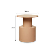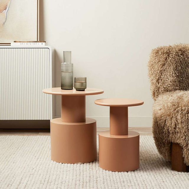 The Zayne Side Table boasts a round MDF design with a painted caramel finish, making it a stunning addition to any mid-century or modern aesthetic.